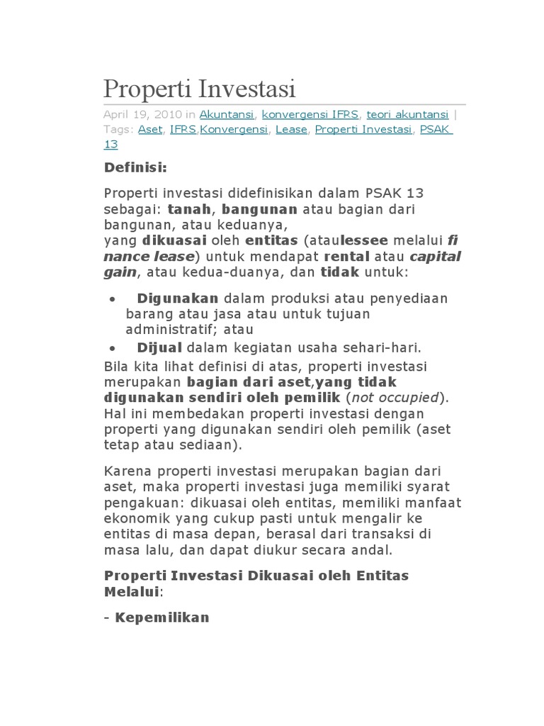 Pertama di indonesia yang fokus terhadap investasi pada sektor properti. Properti investasi psak 13 ed ed ai psak 13 (07 sept 2015).indd 1 07/09/2015 10:04:11. Pengertian investasi investasi merupakan atas sejumlah dana atau sumber daya lainnya yang dilakukan pada saat ini, dengan tujuan memperoleh sejumlah keuntungan di masa yang akan datang (tandelilin:2000).