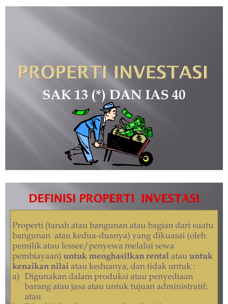 Properti investasi dapat dikuasai untuk menghasilkan rental atau untuk mendapatkan kenaikan nilai atau keduanya. Dari definisi ini dapat kita pahami. Mengelola properti sebagai investasi / bisnis.